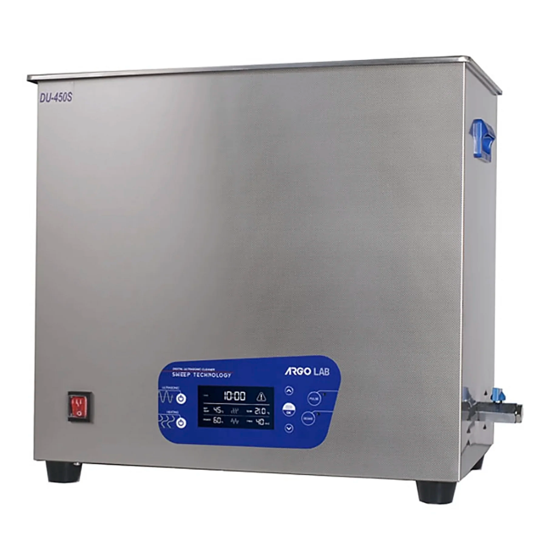 DU-450S Baño ultrasónico digital capacidad máxima 45 L, temperatura máxima hasta 60 °C, temporizador 1-99min, control de potencia ultrasónico 1-10. Función Degas y Pulse, posibilidad de trabajar a 28 y 40 KHz. Cesta de malla inoxidable incluida, tapa de acero inoxidable